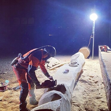 Kettensägekünstler Florian Lindner fertigte informative Sitzbänke zum Thema Klimawandel für den Elbauenpark.