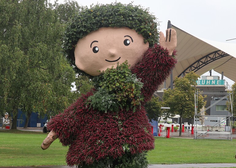 Im Elbauenpark Magdeburg werden alle Besucher*innen am Haupteingang von einem lächelnden Fernsehhelden empfangen. Dabei handelt es sich seit Eröffnung des Parks um das berühmte Sandmännchen. Im Wechsel der Jahreszeiten wird der TV-Star immer wieder kunterbunt und hübsch bepflanzt.
