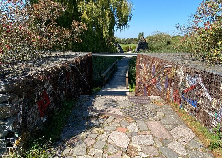 Zwischen den versunkenen Gärten und dem Irrgarten gelegen, finden Besucherinnen und Besucher eine Holzbrücke. Sie führt in Richtung der 176 Stufen hinauf auf den Aussichtspunkt. Zum Auftakt erhält man einen außergewöhnlichen Einblick in das Innere der ehemaligen Deponie. Hinter hohen Steingittern kommen entsorgtes Plastik, Verpackungsmaterial und Schutt zum Vorschein.