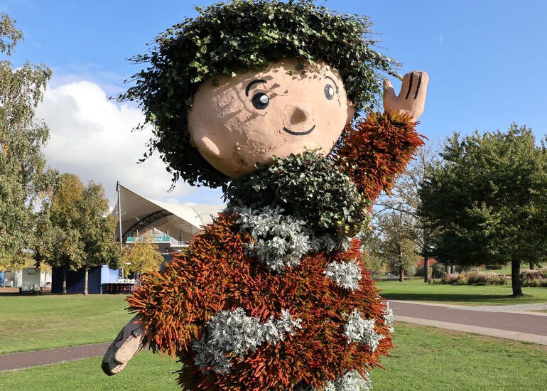 Alle Jahre wieder. Mit dem Herbst und Winter braucht auch der Sandmann am Eingang des Magdeburger Elbauenparkes eine neue Garderobe. Das Gartenteam schneidert ihm immer eine Mode auf den Leib, die der Witterung trotzt und ihn frisch und freundlich erscheinen lässt. Die florale Pracht soll bis zum Frühjahr halten. Der Look im Winter: eine Kollektion aus pink-roter Heide, grünem Efeu und weißgrau schimmerndem Silberblatt sollte das Begrüßungsmännchen in der kommenden, kalten Saison tragen. Sollte!