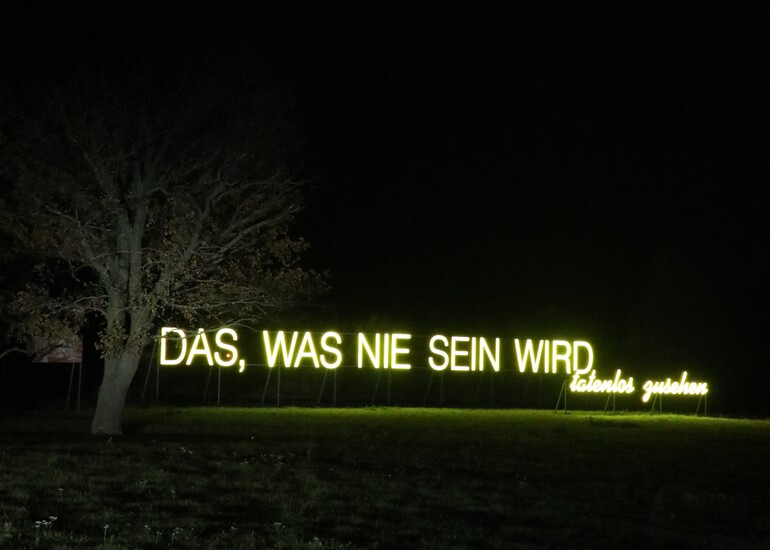 Im Osten des Großen Cracauer Angers leuchtet es: Die neongelben Buchstaben des Künstlers Ludger Gerdes wurden in den vergangenen Wochen erneuert und an die Elektrik angeschlossen. Die Panorama-Lichtinstallation im Elbauenpark Magdeburg funkelt jetzt wieder im neuen Glanz. Direkt hinter dem Damwildgehege ist in Großbuchstaben zu lesen „Das, was nie sein wird“, darunter steht in Schreibschrift „tatenlos zusehen“.