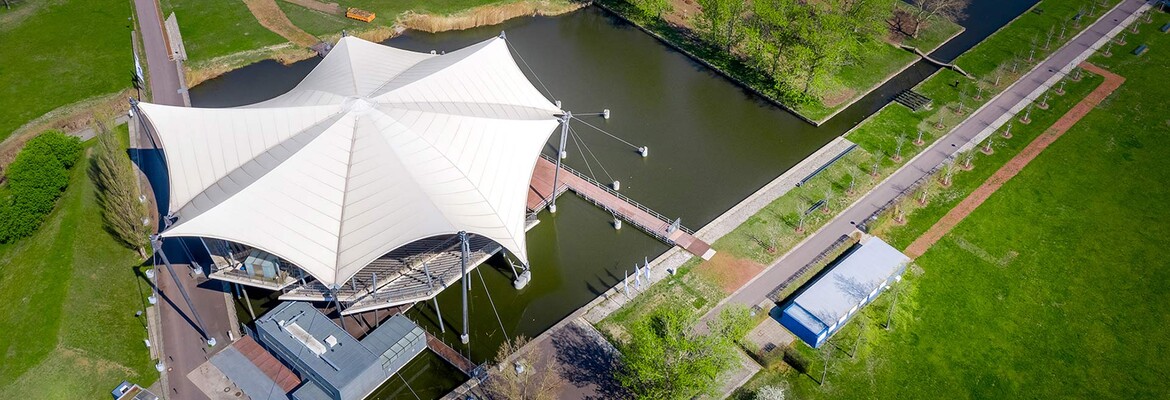 Das überdachte, von Wasser umgebene Amphitheater ist einer der reizvollsten Open-Air-Veranstaltungsorte in ganz Deutschland. Diese Überdachung hat gleich mehrere Funktionen: Sie sorgt für eine gute Akustik und nimmt an der Unterseite Beleuchtungs- und Tontechnik auf. Gleichzeitig bewirkt das Dach mit seiner "zweiten Haut aus Glas" ein interessantes Spiel mit dem Licht.